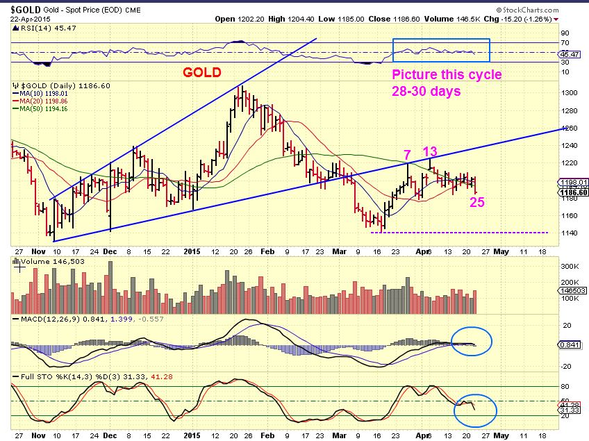 GOLD April 22 – we have gone sideways and may be starting the drop into a Daily Cycle low. If gold is on Day 25 , the cycle length can be anywhere from now to 30+ days. I want to see the purple dotted line hold to show that March was the ICL.