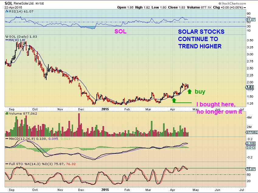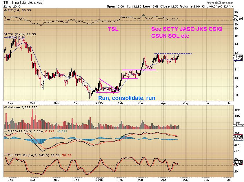 I have liked SOLAR stocks since January and have mentioned from time to time that I am trading them and that they are actually in an uptrend. I don’t hear people talking about them, but if you look up SCTY, TSL, JKS, CSIQ, JASO, etc – these are very bullish up-trends. They can be BUY & HOLD candidates for those that like to invest and leave their $$ parked somewhere. 2 examples below: