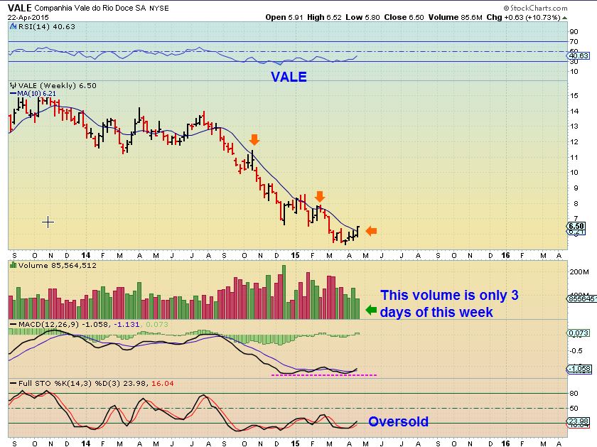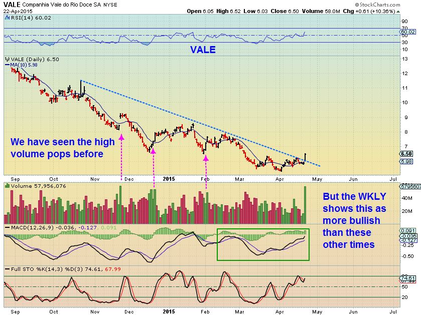 I have been watching CLF, VALE, CAT, and a few other stocks that would indicate to me that possibly a low in Metals/ Mining could be approaching. I have seen POPs in VALE in the past, but the weekly now indicates that VALE and CAT may have bottomed. I expect them to do well from this point. This is what I am seeing …