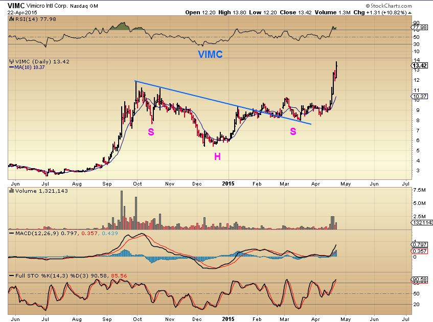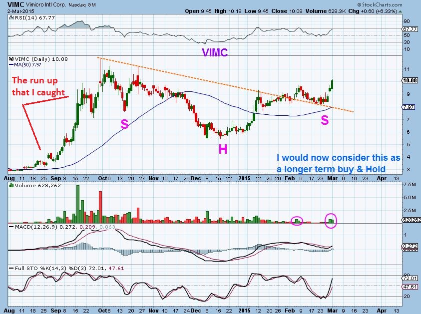 I also traded a stock & did so real time on this website last summer called VIMC. It was breathtaking as it ran from $3 to $12. It then started a HUGE consolidation . HUGE ! Forming an inverse H&S that I pointed out here . The buy was actually $9 ish