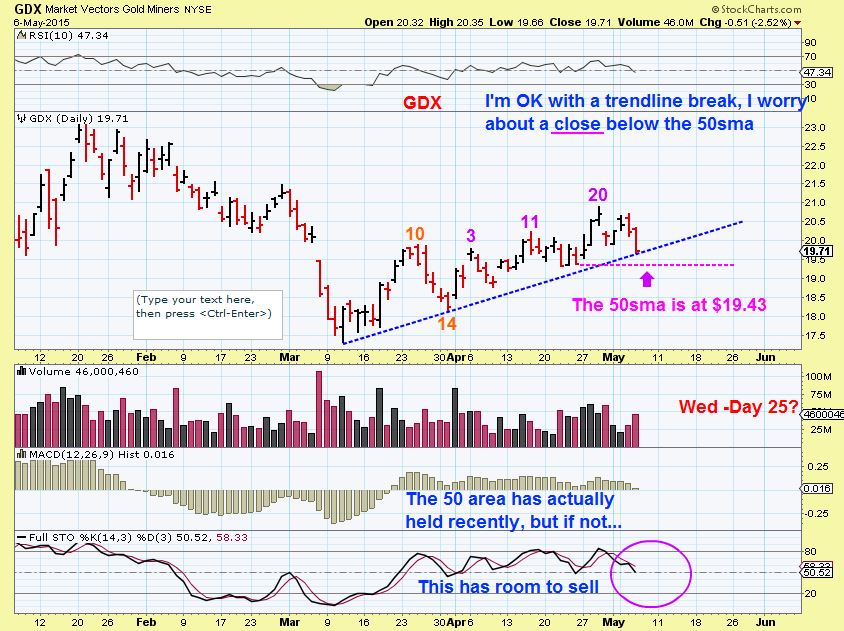 Though GOLD is just spinning its wheels a bit, the Miners have been stronger in a mini uptrend ( See the weekend report for GDX:GLD, etc ) . I want to re-post the chart for GDX as of Tuesday first. See the 50sma is below the trend-line. GDX can go there and reverse and I would personally love that. The trend-line break will shake out longs.