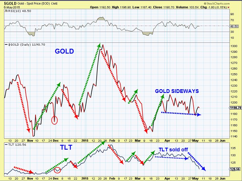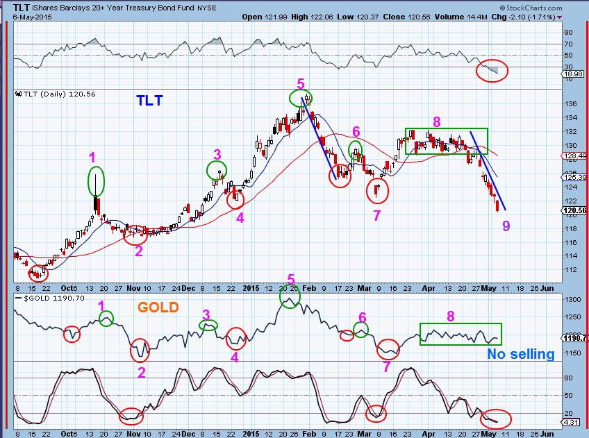 1. Gold and TLT made highs at similar times ( Green circles 1,3,5,6,8) and sold off to lows at similar times (RED circles 2,4,7).