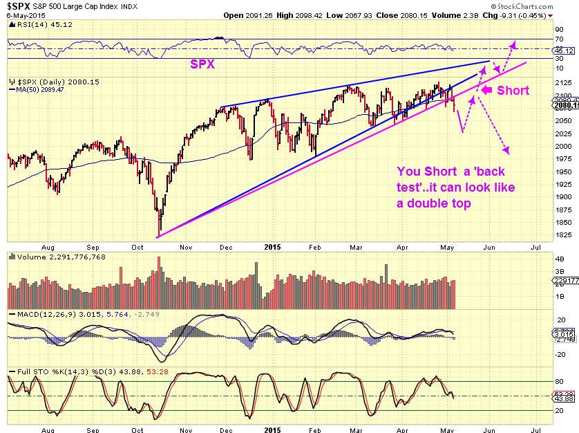 This is the tough part for those hungry to short the markets. It is possible for a waterfall plunge to happen here, but the safest short is to watch it play out. Usually you get a break down and a back test. THAT is the short if it is acting correctly. It looks like this…