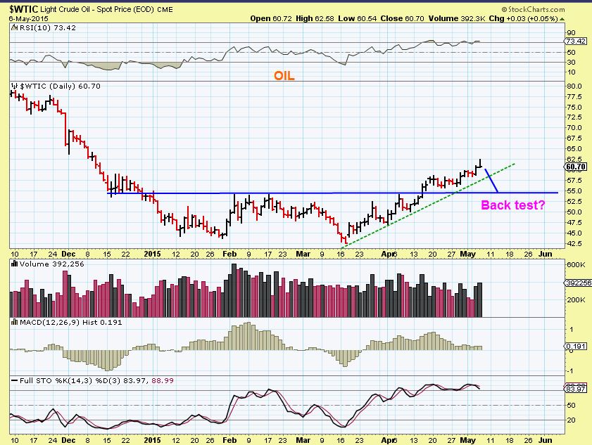 The OIL pullback could get that far and test the break out, but it has been a strong run and may only dip slightly and go sideways it if continues strong. Its tough to tell at this point. It may only drop to the top of the last sideways move near $57.