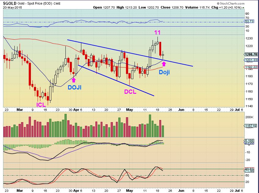 GOLD – Notice how the ICL from March has a run up and then a sharp drop to the blue line.  Did we just have the same thing happen?   Wednesday was a doji and found support on a test of a recent break out & blue line.  I mentioned in the weekend report that gold may fall to the $1200 area and that was ok.  It did, and I would now like to see this hold. Yesterdays low was $1202.70