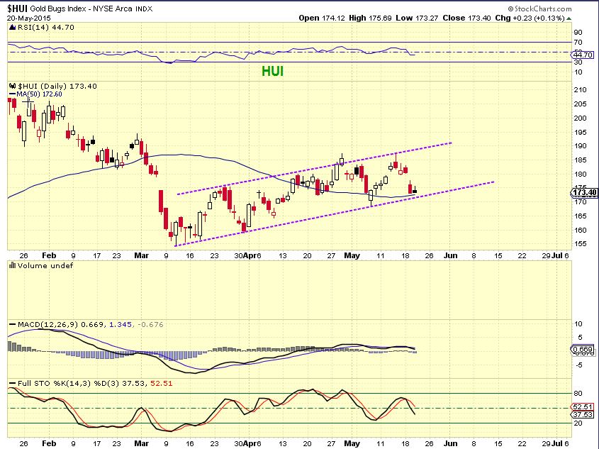 HUI–  Nothing changed on the HUI.  I am watching the HUI, because it is at a critical point of support in my opinion.  If the low of  May 7 is taken out, it is likely more than a stop run.