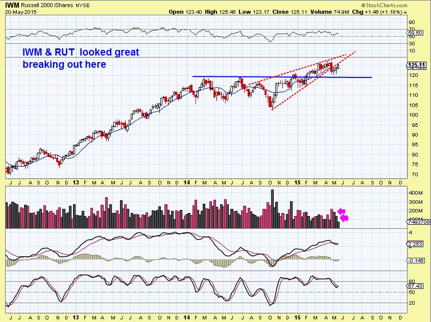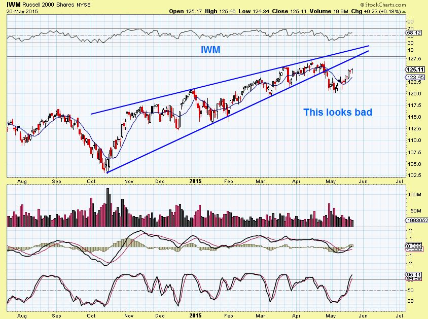IWM consolidated and run upward looked really good recently.  Now it looks like a rising wedge , break down and back test.  It needs to break higher quickly, because that could negate the pattern.