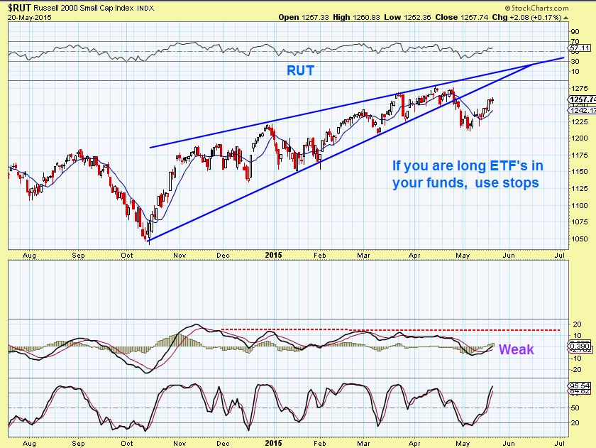 SO I just wanted to point out that what we see above,  along with what appears to be the rising wedges that I have been mentioning could be signs of topping action  ( Or at least a good size correction ).   We have had a very strong bull market without even a healthy 10-15% correction for years now .  My thinking is partly this  : If you are invested in ETFs in your retirement accounts,  PLEASE HAVE STOPS IN PLACE.  And yes, there is more.