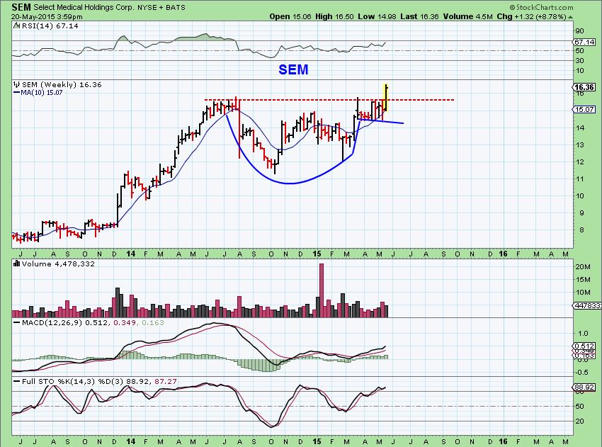 SEM –  This really moves nicely.  Cup / Handle breaking out this week.  It might pullback to the handle , or not.  I would buy now and add if it pulls back.