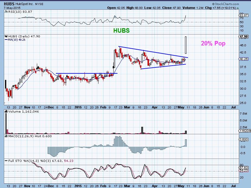 In last weekends report I had a few trade ideas- Set ups that look Bullish. Some continue to set up (So I check them and watch them) others break down, and others break out upside. The ones that break down, your stop gets you out with a small loss, the ones that break out can add up to large gains. Lets look at a few trade ideas (And I want to start with HUBS from last weekends report.