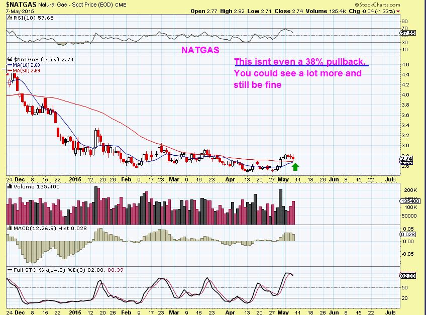 NATGAS sold off after the Thursday report and I actually received a few concerns about Thursdays NATGAS report. Is NATGAS now bearish? I had called for the shake out type double bottom, we received it, but what about now? Answer: Expect dips and examine them, but this is a perfect set up. So I recommended looking at OILs Chart , back when it broke out. Did it go straight up, or dip along the way? Many dips…then I emailed this chart of NATGAS to point out that Thursdays dip was nothing. Its more of a sideways move to the moving averages. Support was there and the dip wasnt even 38%.