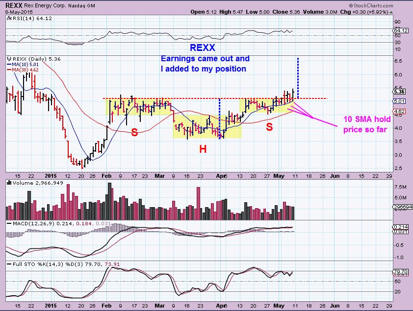 I keep saying that I love this pattern and I expect this to go higher. I added again on the dip to the 10sma. For trade ideas see also EOX, WTI, BAS, NADL, KEG, GDP, VTG, and a few other reversals (SZYM, CLNE, AMRS ).