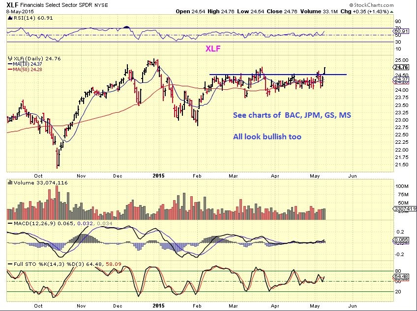 XLF _ Bullish , see bank stocks listed as they have just started breaking higher too. Traders can trade them long.