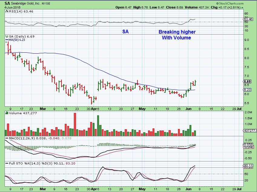 I also liked the looks of SA, SAND, and IAG recently for Gold miners. Not as ones that look to have Bottomed at this point, just resisting Golds current selling. I mentioned SA with this chart as GOLD sold down. It has since gone sideways above the 50sma.