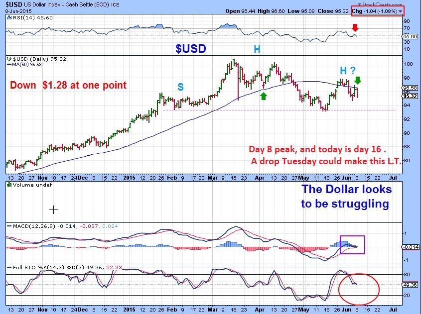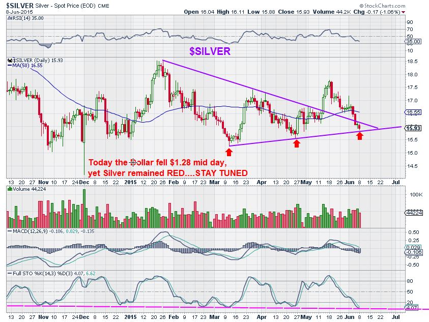 Silver – has held up well all along. The Dollar was down $1.28, Silver stayed Red. Oversold. Hmmmm?