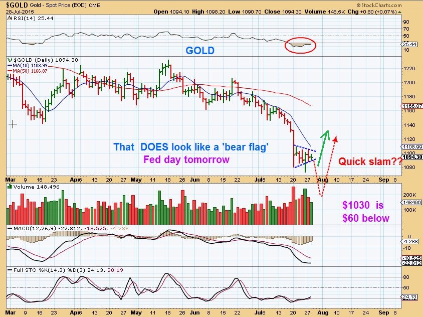 GOLD –   Yes, Gold can still just take off upside, but is this is a bear flag type set up?   A FED COMMENT could cause a quick flash sell off. What might happen if that occurred?