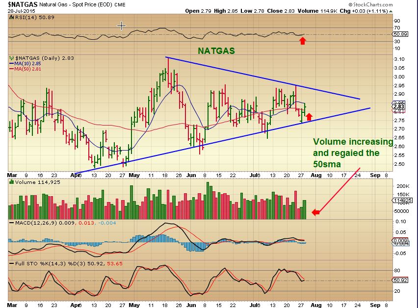 NATGAS – ( Pardon the typo on the chart)  Volume increased on the reversal back above the 50sma. This consolidation has been brutal for traders,  but so far it is a series of higher highs. I’m also still watching the big picture from the weekend report too.