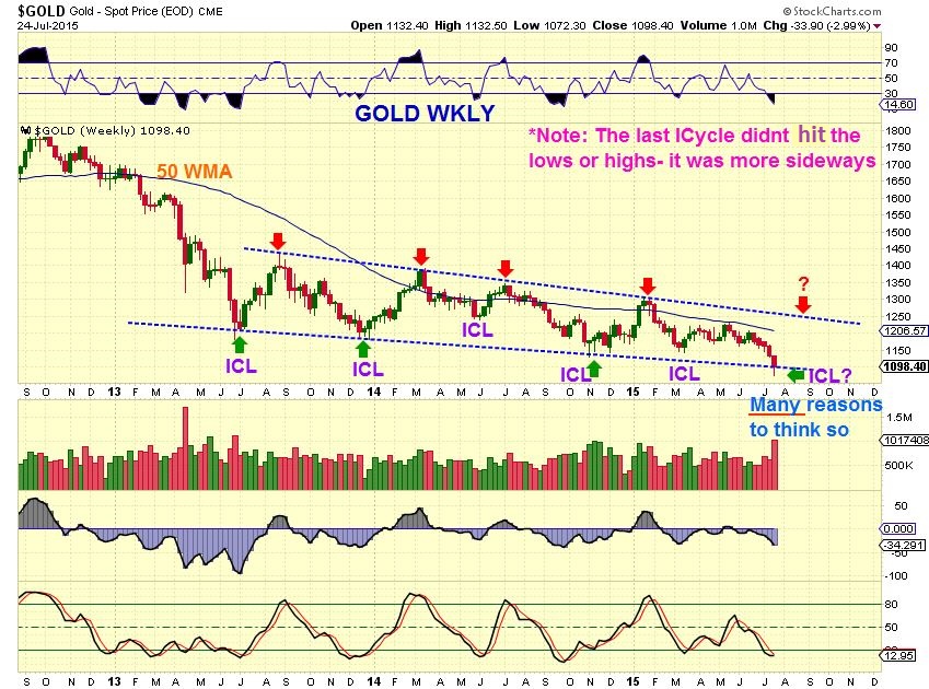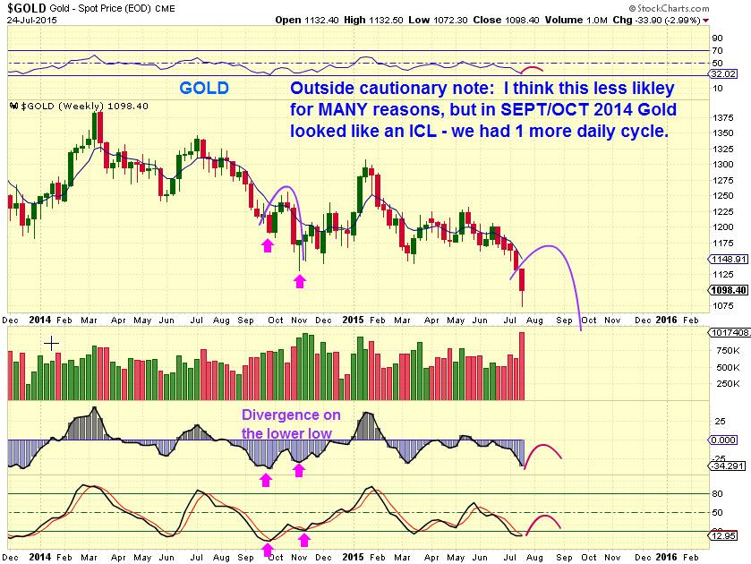 Simply put, there was a time in SEPT / OCT 2014 that we looked like we had an ICL in many ways and we actually bounced for 2 or 3 weeks and rolled over into a final ICL  (1st Magenta arrow to the 2nd).   Many indicators showed an ICL was possible then too, but not as extreme as now.      COULD WE DO THAT HERE to get to $1000 when no one expects it?    I only say maybe because we didnt tag 2008 areas of $1033 pointed out on my chart last week.  Would a 2 or 3 week rally get the bulls over excited and then drop it down like Oct to Nov 2014?  It looked like this.