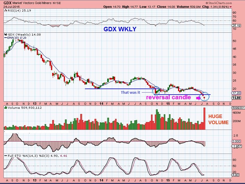 GDX WKLY –  Enough Volume for a capitulation low?  Record volume. Everyone bailed out and not many dared to buy this drop. It is a buy in my opinion, I’ll show you why shortly.