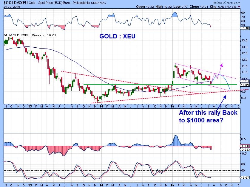 One of the readers at Chartfreak mentioned looking at a Gold :Euro  chart.   ( THX) 🙂  It fell to support & reversed.  Interesting. I drew what it might look like if we run higher and then drop to Gold $1000 area in the future in US dollars.