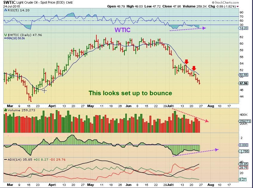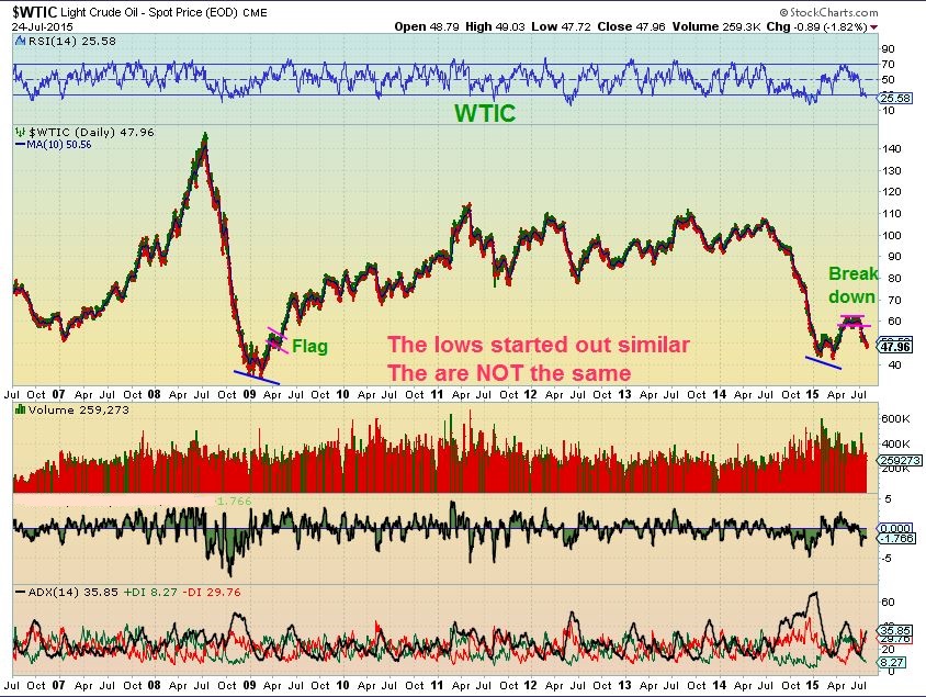 I want to point out that the 2008-9 lows 1. Ran upward  2. Bull flagged  3. Then continued higher.  We are doing nothing like that here.  The dollar dipping here may cause OIL to bounce and tag the 50sma, but testing the 2009 lows  could be ahead.  It might be a good short  (DWTI) if we bounce to the 50sma and price is rejected.