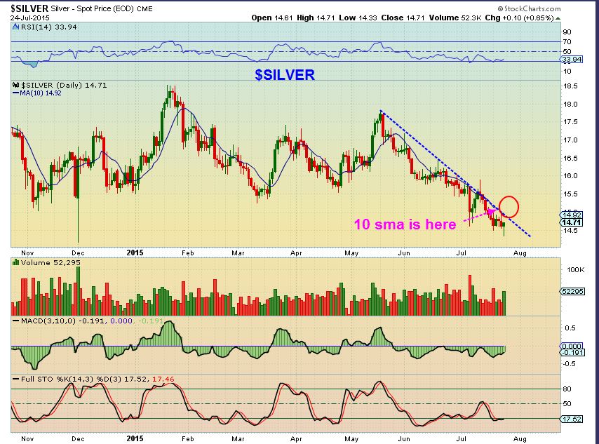SILVER – a break & close above the 10sma on a daily would be bullish, breaking the downtrend line.