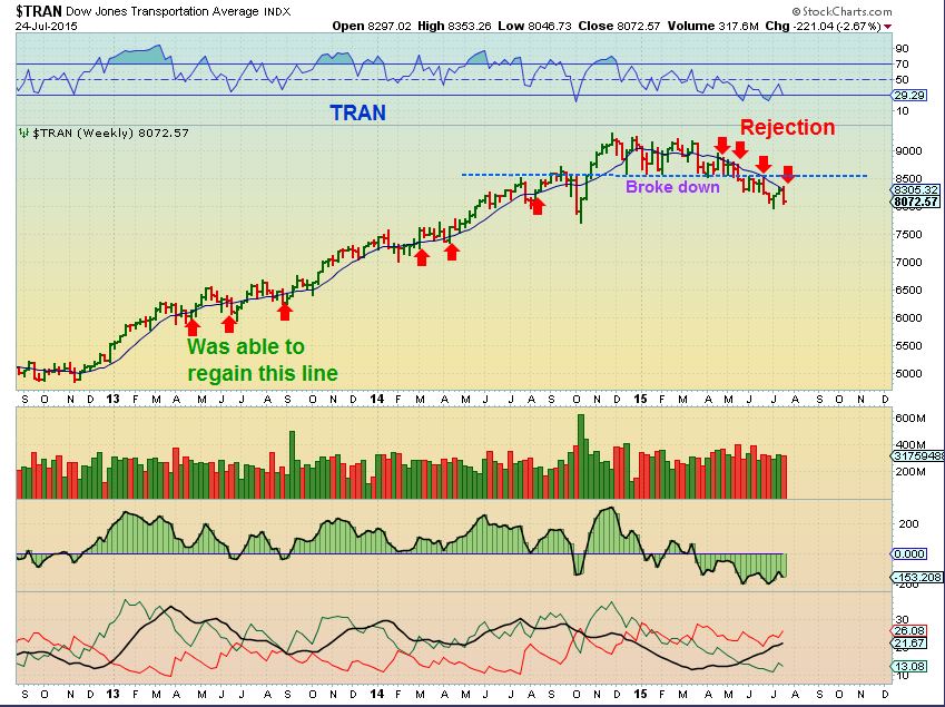 And then we have the DOW THEORY.  I pointed out how badly the TRAN had broken down.  Has it recovered at all with the recent market rally?  This should be in the back of everyone’s mind as we go forward. The blue line is the important 10WMA, and it continues to reject price.