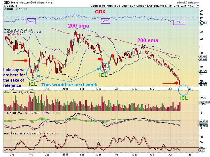 Last summers ICL  – 2014 –  I was writing the Chartfreak reports and called THE LOW on May 28 , using the same indicators that just triggered GDX BUY yesterday.   look how long you had to buy.   I remember people writing to me and saying  , ” Its a bear flag, its going to drop!”   It was too late in cycle timing to drop much more.    SO looking back, Did it hurt to miss THE day that the sell off ended and price went higher?  Was it important to catch THE LOWS ?  Not really.  4 days after May 28 , price was the same.