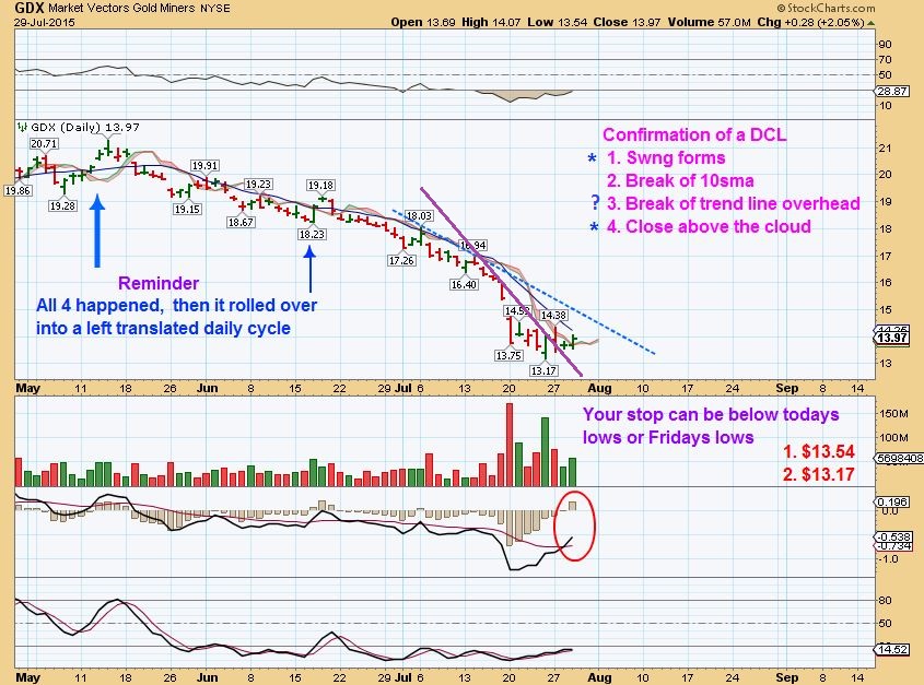 We really don’t have confirmation of a DCL yet either. Besides a swing gold would need to break the cycle down trend line to confirm the DCL. So if gold gets hit with another attack it would stretch the current daily cycle. This has been a problem lately in that the market has figured out how to run cycle traders stops by creating false DCL’s and then running the lows and stretching the cycles.