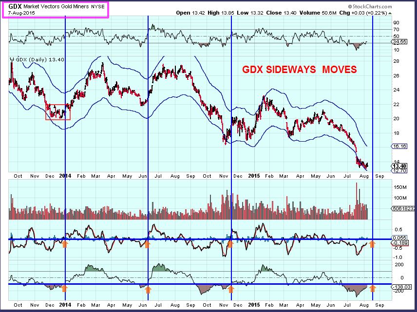 I developed a few indicators that I use during sideways moves at lows. You wouldn’t enter a position until the lower 2 indicators cross upward. They dont cross well after the rally starts, but they often cross when the price closes over the 10sma. Most bottoms were a success, but last Nov price looped back down and double bottomed, so it got you in at $18 GDX and then you may have been whip sawed out before the real run up in Dec. They haven’t crossed at this point yet.