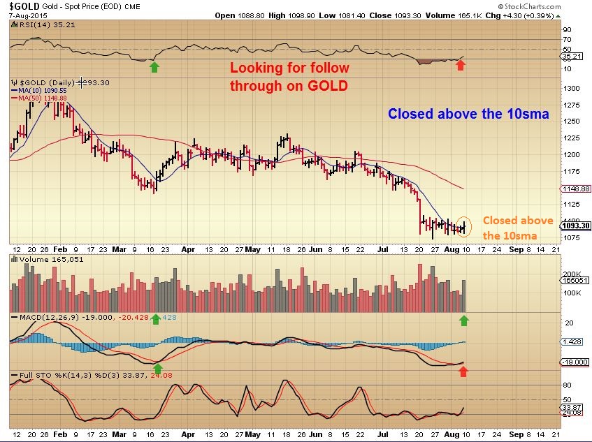 Technically, GOLD did close above the 10sma and we have a MACD cross. We just need some follow through and maybe we can get some short covering rallies in some of our Miners 🙂 Watch the $1090 area for the 10sma.