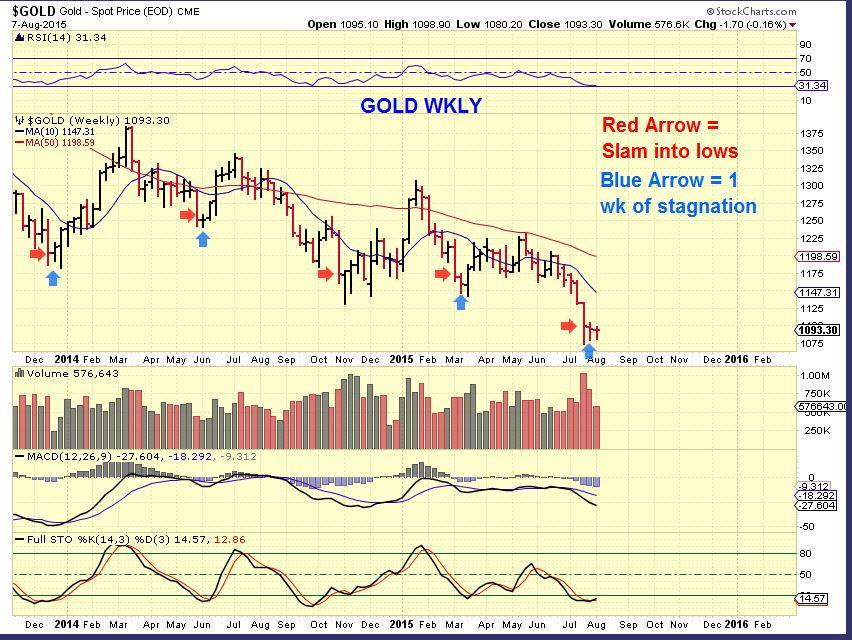 People get very impatient at lows. When GOLD is ‘bottoming’ there is always a chance for it to drop lower. Looking at past lows in Gold on a weekly chart, notice please that it is not very different from what we see now. A slam down, a lingering at lows, now we just need to go higher. Yes, we remain ‘cautious’, because we could get a drop lower, but so far the bottoms look similar.