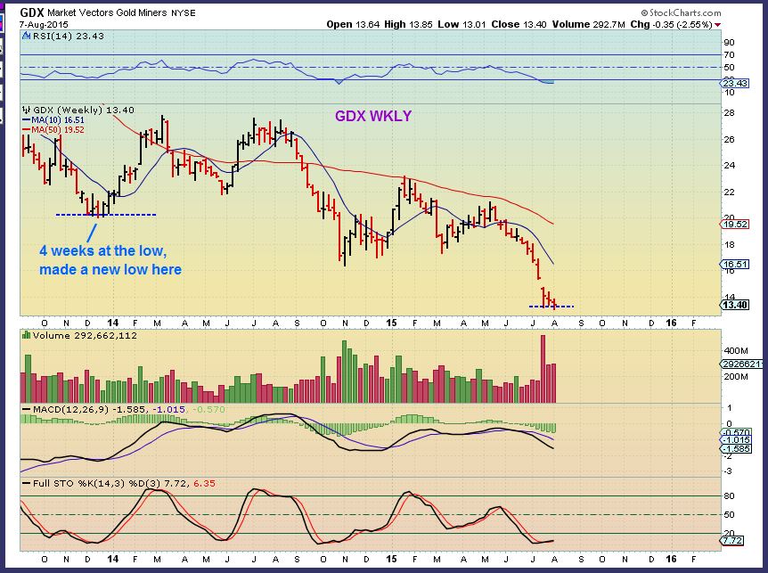 WKLY GDX – I’m trying to show the same thing here. Lows can be a “process’ . V-Bottoms are rare in Precious metals. We made a new low in GDX last week and it bothered some. Notice that we did the same in Dec 2013, and rallied shortly after making the new lows.