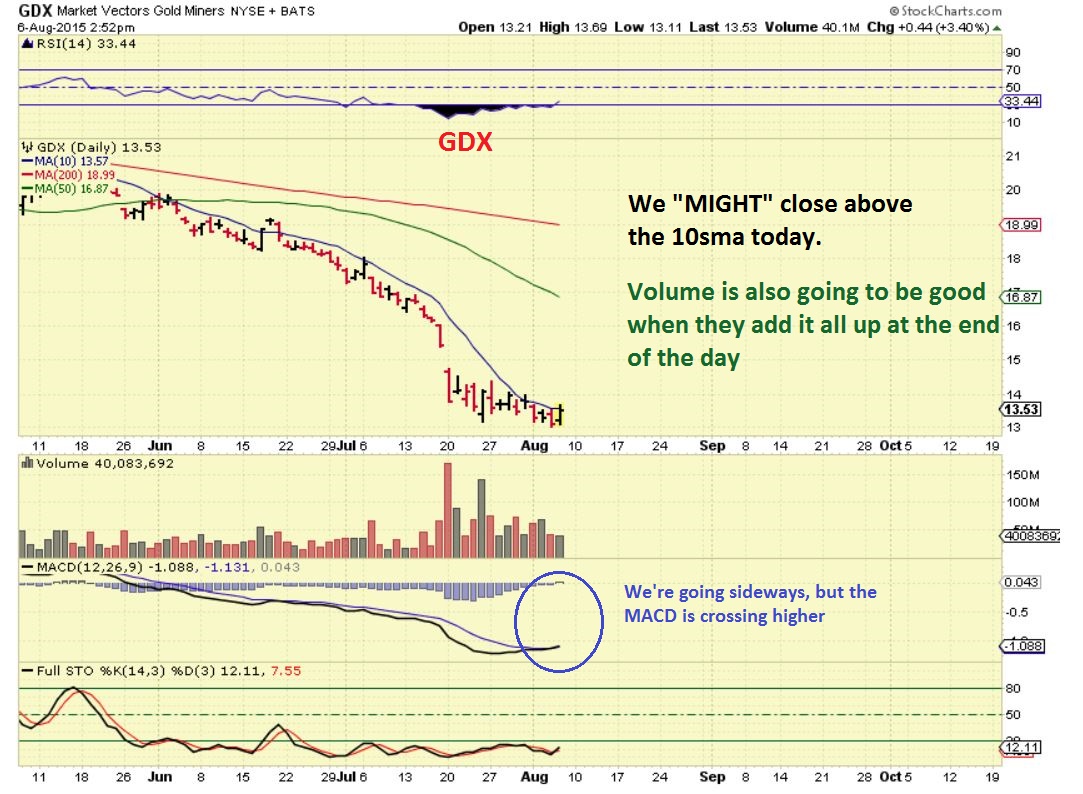 GDX – it could close above the 10sma today, or it may sell off into the close. Either way, you must ask , “Do I want to buy before Jobs report?” You must decide, some whip saw can still be ahead. We’ll discuss a few things to help you decide.