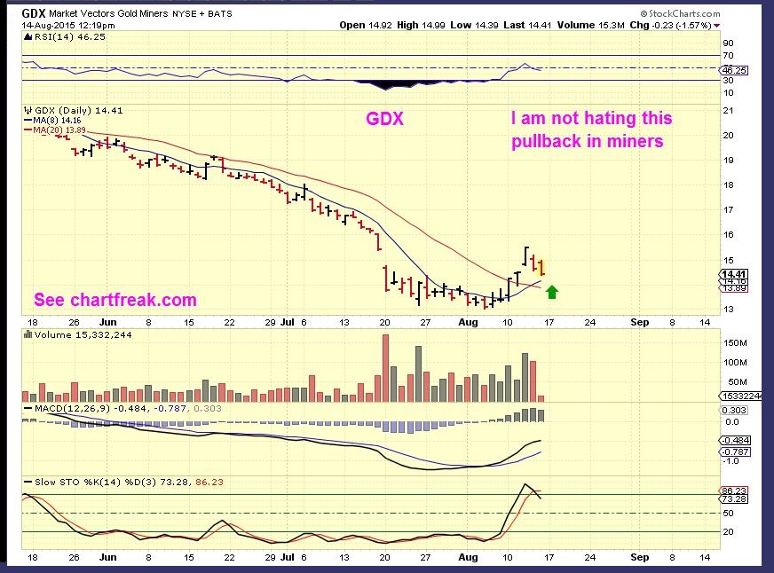 Appreciate the time you took to post this. I was looking for a pullback today and thought GLD pullback was fairly normal. I did NOT like GDX & J pulling back this much, that fast – maybe over two days but not all at once. Wish I had pulled a little more off of the table. BUT, I didn’t let it deter me. I sold GLD calls (stopped near open) I had b/c they expire next week and had a profit cushion so just cashed out ITM. I did get stopped out of PPP by accident (breakeven, no loss). I didn’t think it would hit today – was right at the lows. It happens. Still holding GDX (monthly calls) and AUY. Looking to add but didn’t want to do much with such a strong down day in case it bleeds over into tomorrow. Would be nice/interesting if gold were still down a bit but miners rebounded into the weekend.