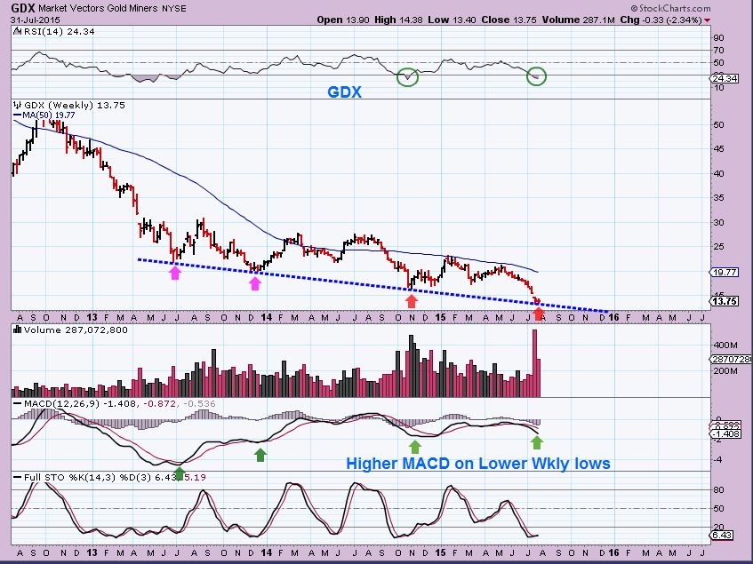 GDX WKLY – Oversold and on the trendline support. Lower low and higher divergence in the MACD. Bullish.