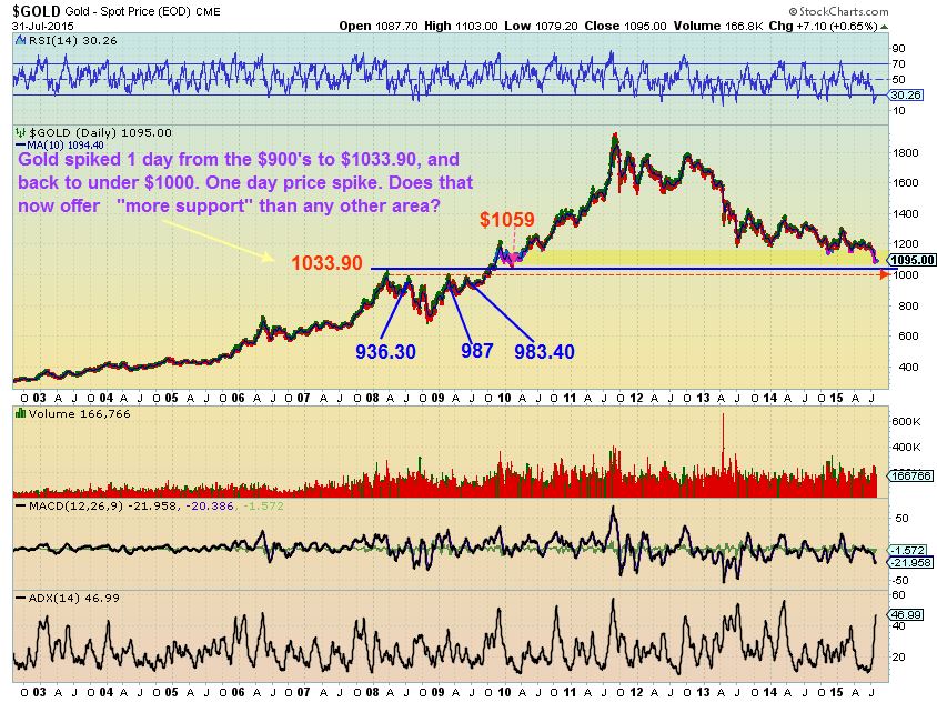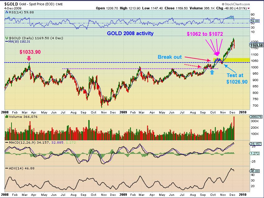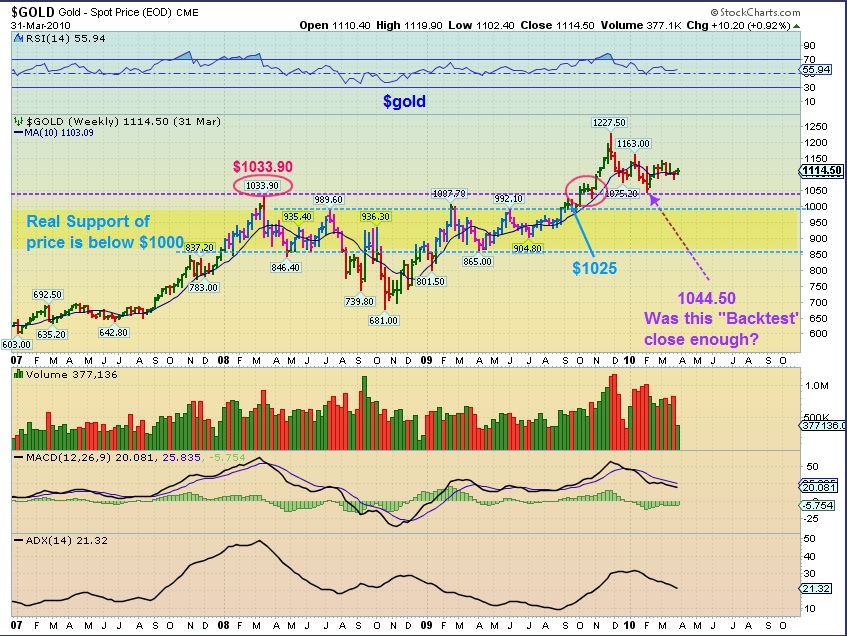 GOLD 2008 “test”. Noticed that the ‘one day spike’ of $1033.90 area may have already experienced a minor ‘back test’ back in Oct 2009’s break out . We bounced around the $1070 area, where Gold is bouncing currently. So we have some minor support right here & below. Stronger support is also below $1000. A one day price spike to 1033.90 does not offer ‘Much stronger support’ in my opinion. The purple dotted line is stronger support.