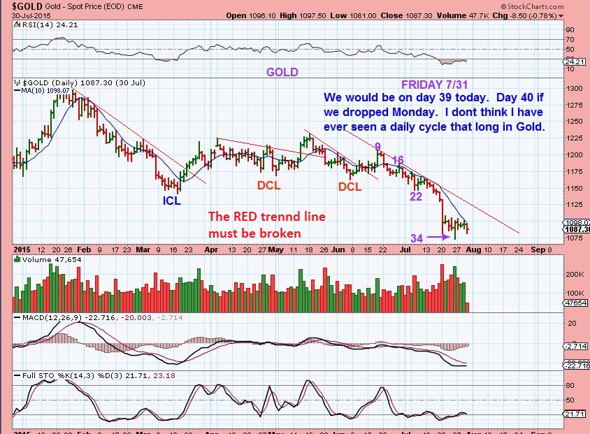GOLD– Most likely an ICL at day 34, but the Daily Swing from day 34 has not ‘confirmed’ as a DCL ( or ICL), so a break below $1072.30 would be DAY 40!! VERY VERY STRETCHED cycle wise. I think we rally higher this week.