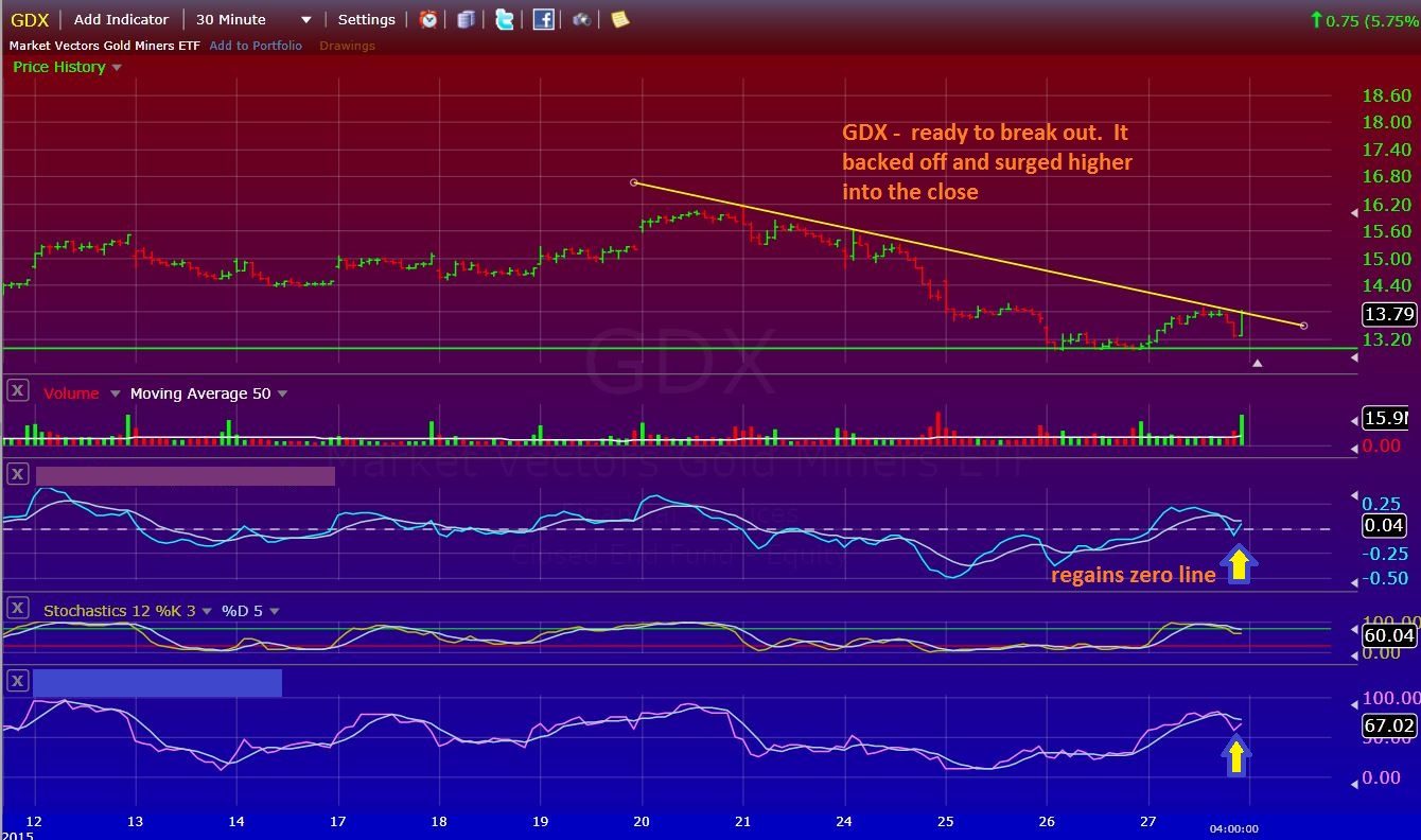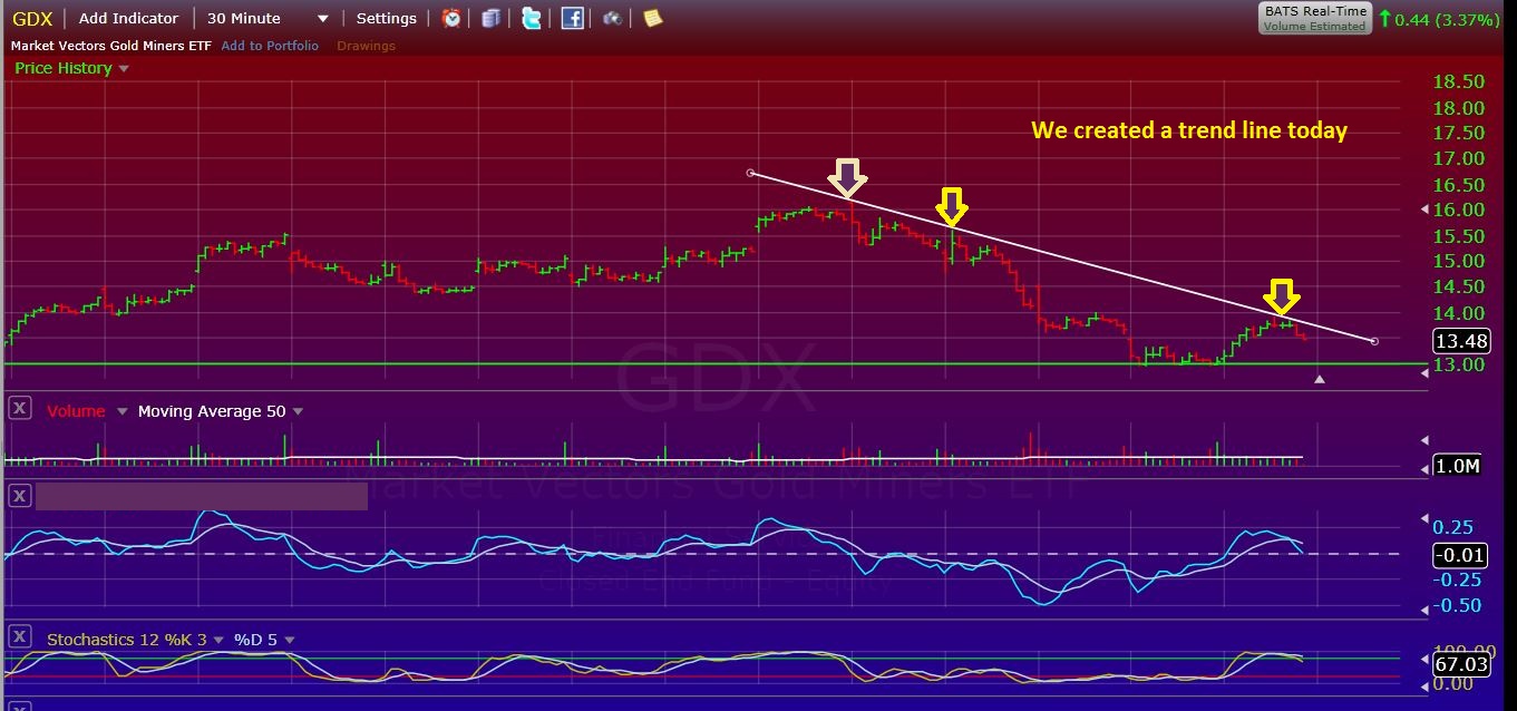 I was watching as GDX created this trend line this morning.  I’d look for a break above it. I pointed it out to DESHY in the comments section. A break above is a buy on a daily, and we’ll probably gap above it, and come down and test it.