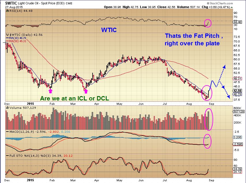WTIC – Finally, this is what I have been admonishing people to wait for.  Todays burst is similar to the start of both the January & March move higher.  We are probably starting a new  ICL.  For now, we have a strong move higher from the lows.  The weekly chart looks excellent too.  I drew the blue dotted line down in imitation of what happened in Jan – Feb…but I do NOT think we have that here.  We’ll see how oil acts at the 50sma  (pause & break higher is likely).