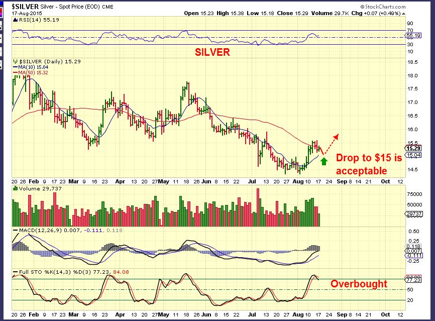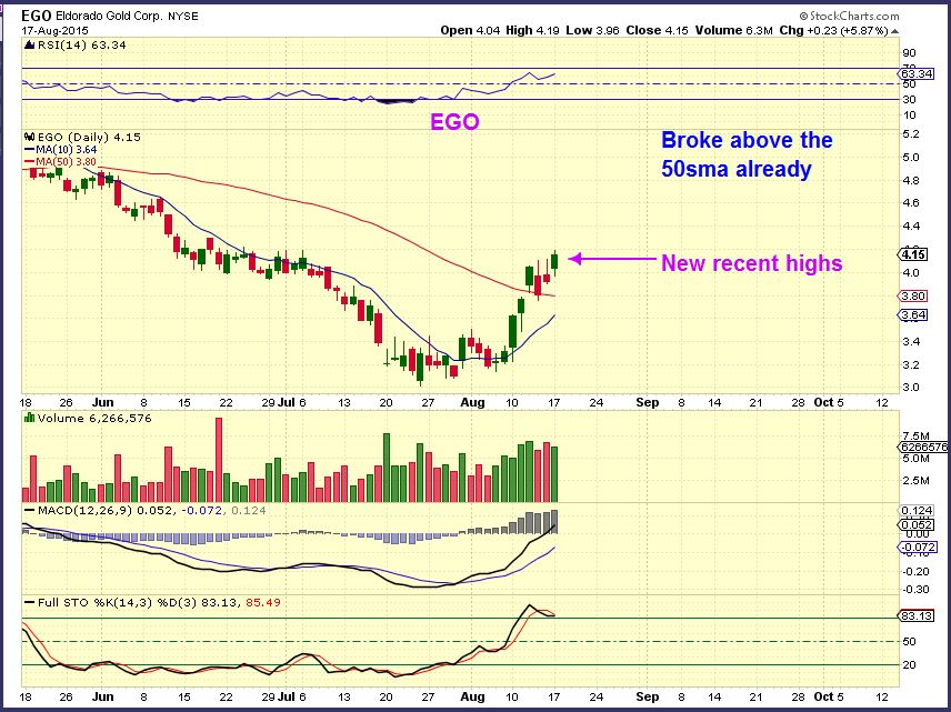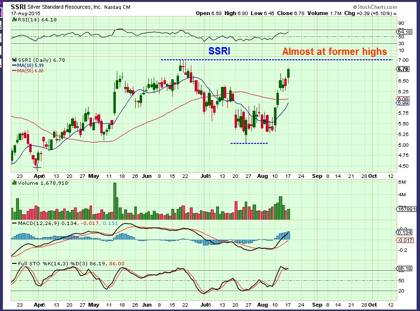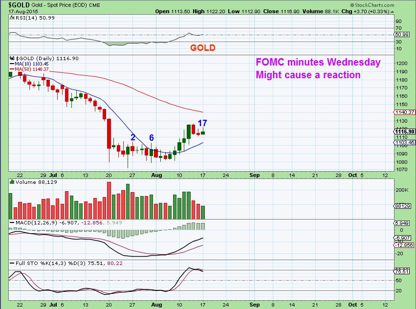 I gathered my charts last night and started writing at 6 a.m. When I started Gold had run up to $1121, but now (8:15 a.m. ) both Gold & Silver are selling off. I imagine that we aren’t going to see solid follow through before the FOMC releases the minutes. I cant say what the initial reaction is going to be after that, but the longer term expectation is for a move higher. That means we can look for buying opportunities on pull backs in Mining Stocks. I really like the silver stocks, and as I write Silver is selling off, so look for some of those stocks to either ‘Hold up nicely’ as Silver drops, or maybe they drop to their 10sma or hold the 50sma and can be considered for a buy.