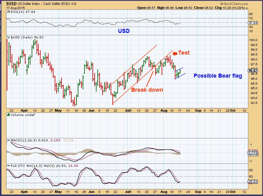 $USD – I have said that the dollar looked internally weak in its climb. It has since dropped and now is climbing again. I do not see strength in this move either. Possible bear flag. ( Good for Gold?)