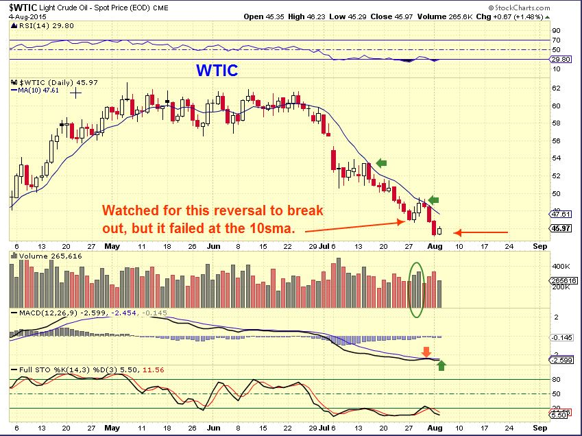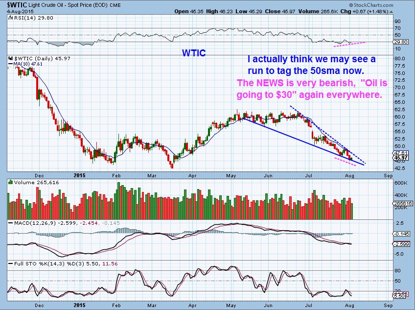 WTIC #2 –  This pattern with divergence  and the extremely bearish negative news that I’ve been hearing could cause a break out & test of the 50sma. Then when people start saying OIL to $70 again,  we may roll over again.