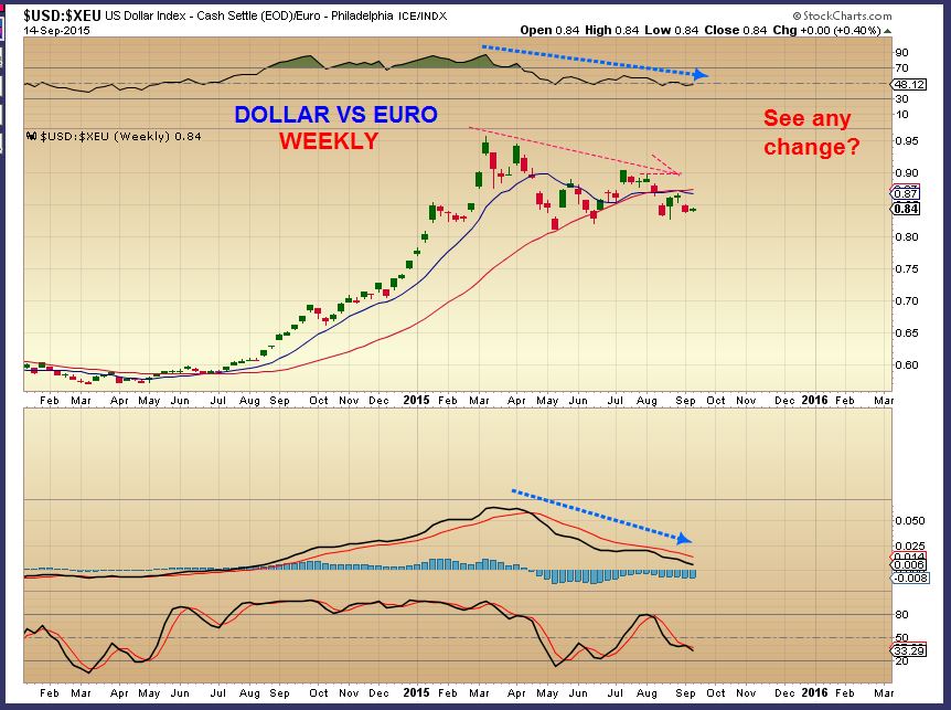 The above 2 charts along with many other charts point to a possible change in trend, where the dollar is losing strength.  We see commodities, including precious metals, possibly bottoming in a significant way.   I wanted to point this out so that we aren’t overly focused on the Fed Thursday.  Yes, that decision will likely cause a rumble up & down in many sectors, we can expect short term volatility , but the longer term picture looks to be that of change.  The dollar was running straight up, but now it is struggling. Commodities were getting pummeled and now seem to be basing / bottoming. If we can remain focused on that, we may be getting in at the bottom of a new long term and profitable run in commodities.