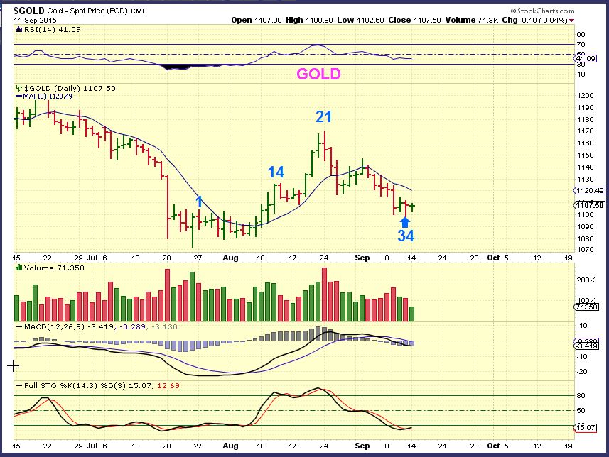GOLD – Gold currently has a day 34 low at that $1097 area.  It is oversold and definitely in the normal timing for a DCL, but will there be buying before the Fed decision Thursday? The difficult part for many is that even if Gold takes off higher, there will be concern that the Fed decision could knock it down.  Technically, it is a buy with a close (or move) over $1120. Keep stops in place, the Fed decision will not be an overnight gap down.