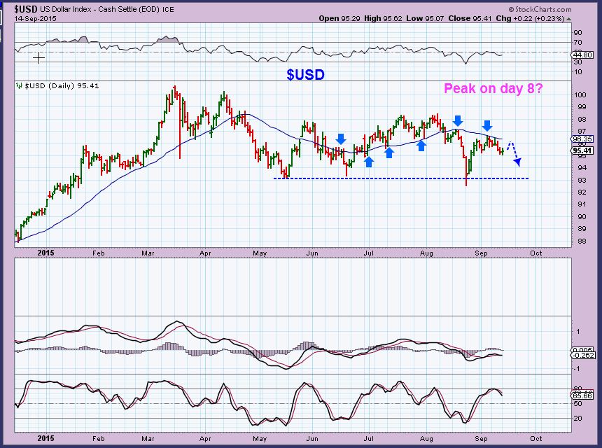 USD –  The USD peaked on day 8 of a new daily cycle. That would be a L.T. Daily Cycle if that day is not exceeded, and with current weak symptoms? I think the dollar will continue down.  It too has been a slow motion sideways move.