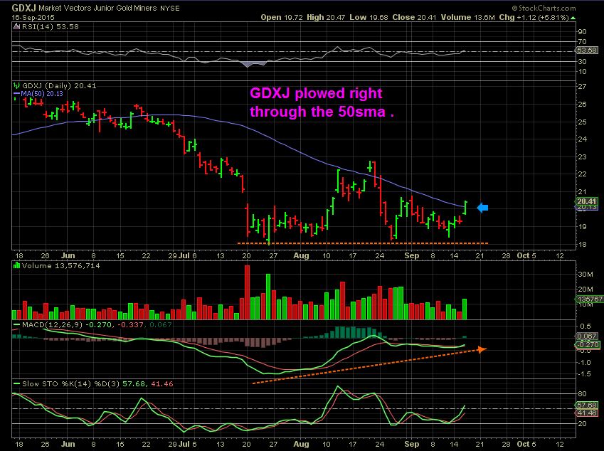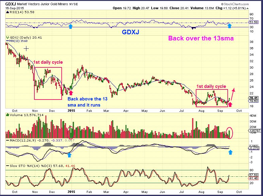 I have pointed out that a break above the 10sma ( and a close there) is a safer area to take a position in GDX. With GDXJ I used the 13sma.