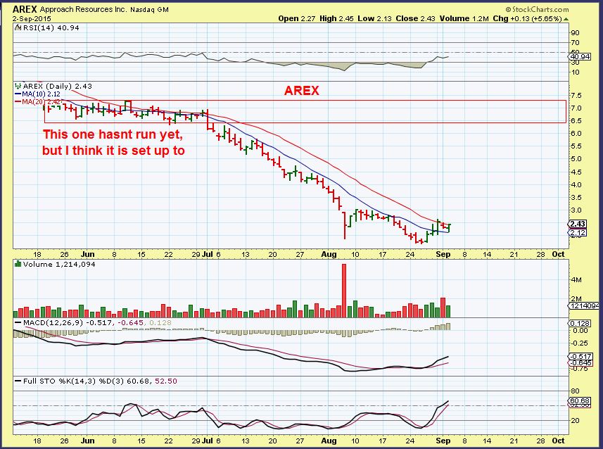 DNN is a Uranium company and they have been hot & cold lately, but this set up looks good because it sits on the bottom currently. Low risk with a stop right under the lows.  ( NOTE:  DNN is under $1.  Some prefer to avoid cheap stocks).