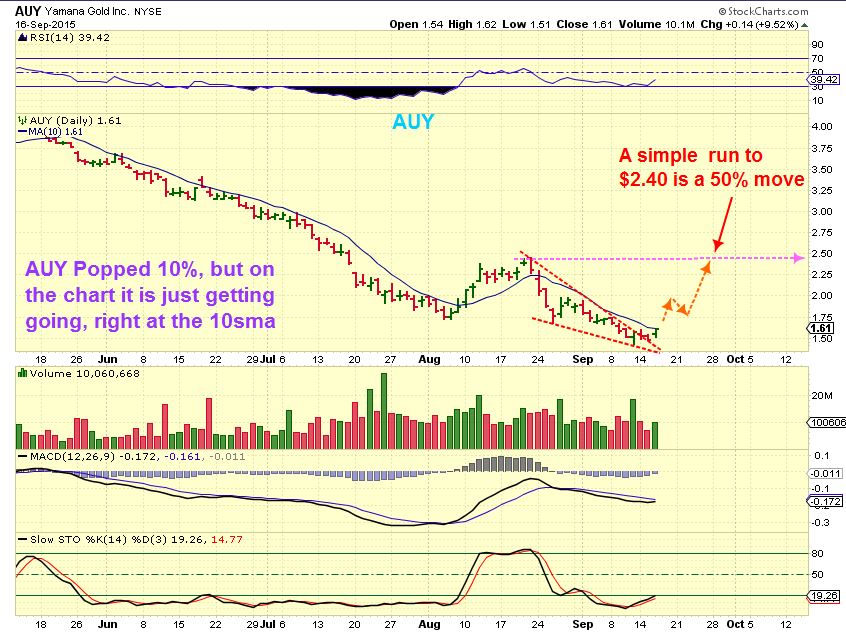 Some MINERS exploded yesterday. We saw beaten down low priced juniors jump 10,20, 25%!   AXU jumped 35% in the past week . Lets look at some Miners for an example of what to look for when buying. We are seeing a pull back in futures this morning for an opportunity.  Some still may wish to wait until after the Fed Decision is released and markets calm down.  I still expect the reaction to be in both directions based on past releases.