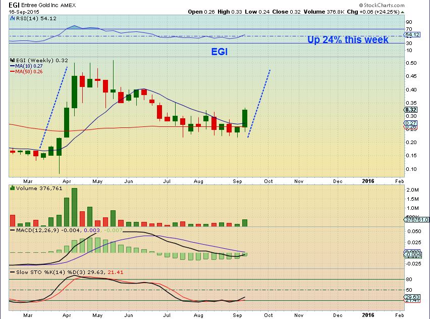 EGI Wkly– I point this low priced stock out for its movement in recent times and its possibilities over the long term when Gold bottoms and begins trending higher. Notice the strong tun at the  March ICL. ( only 450%).  It is moving again, up 23% yesterday alone.  Why important?